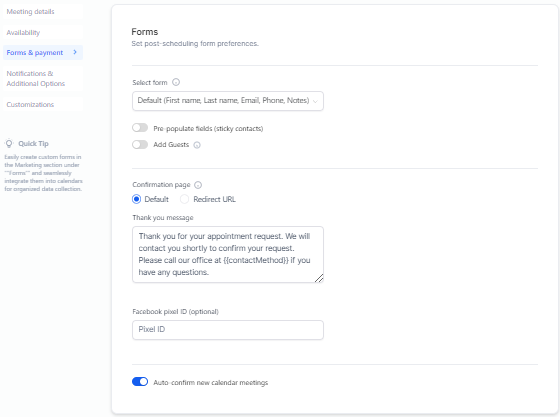 - Form submit Redirect URL - In case you have a confirmation page and want visitors to go to the next level of the funnel. Once someone makes a booking, you can show them a custom message on the same page (Default) or redirect them to a page of your choice (Redirect).