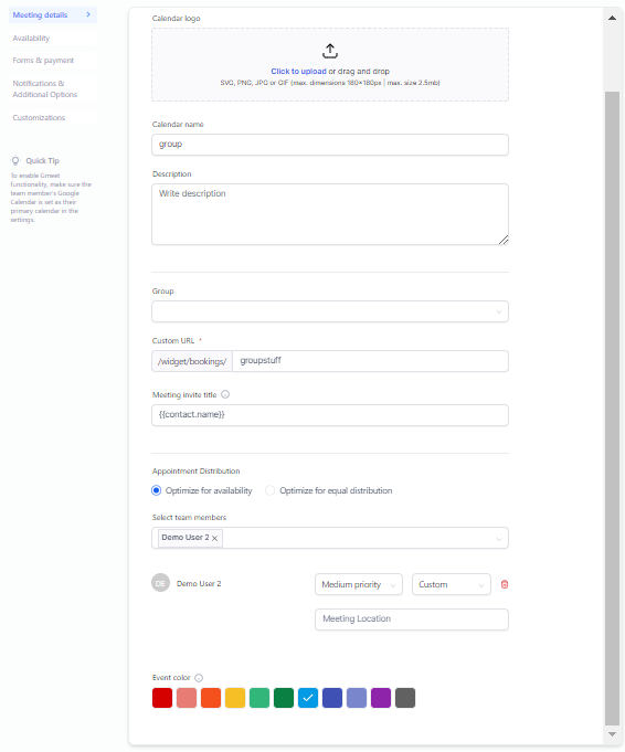 - If you edit the calendar later or select Advanced Settings, you will be met with the following menu: First image is Event, and second image is Group/Class/Collective (The difference is adding specific team members and priorities)