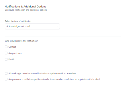 - Select the type of notification - simply for an acknowledgment that an appointment has been scheduled message and can be sent to the contact, assigned user (on round-robin calendars), or specific emails.