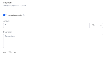 - Use Stripe Payment – Must have Stripe integrated into your account. Choose Amount, Currency type, Test/Live, and message for charge description
