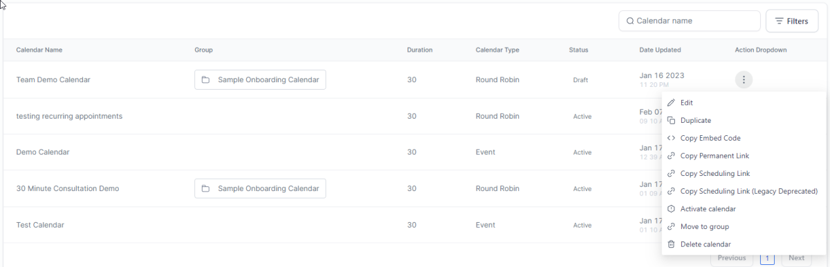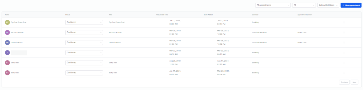 - Navigate to Calendars > Appointments to filter for appointments based on Calendar, Status, and Date.