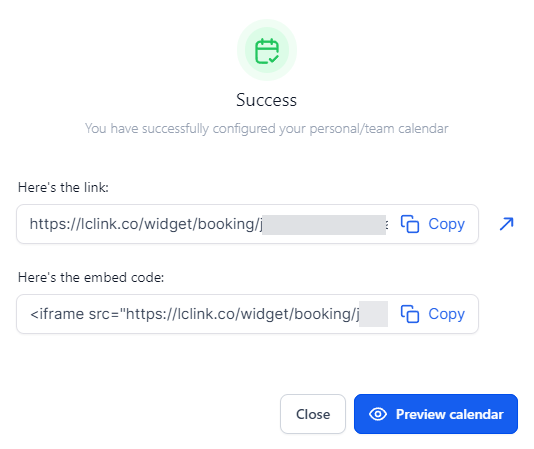 - Once you hit confirm, a menu will appear where you can copy the link and embed code for the calendar. You are also able to preview the calendar link.