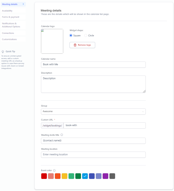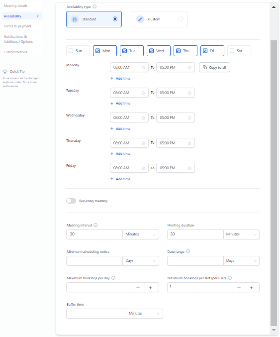 - Meeting Duration – Duration of each appointment (30 minutes, 1 hour, etc.)