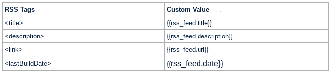 The RSS Header element will dynamically populate <channel> tags from your RSS Feed. This supports the following RSS channel tags - use their respective Custom Value to populate the email with the corresponding tag value: