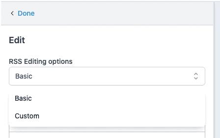 When using the RSS Header element, you will see two editing options: Basic and Custom.