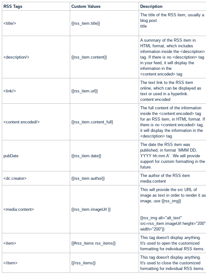 The RSS Items element accepts the following custom values and will dynamically insert their corresponding RSS Tags.
