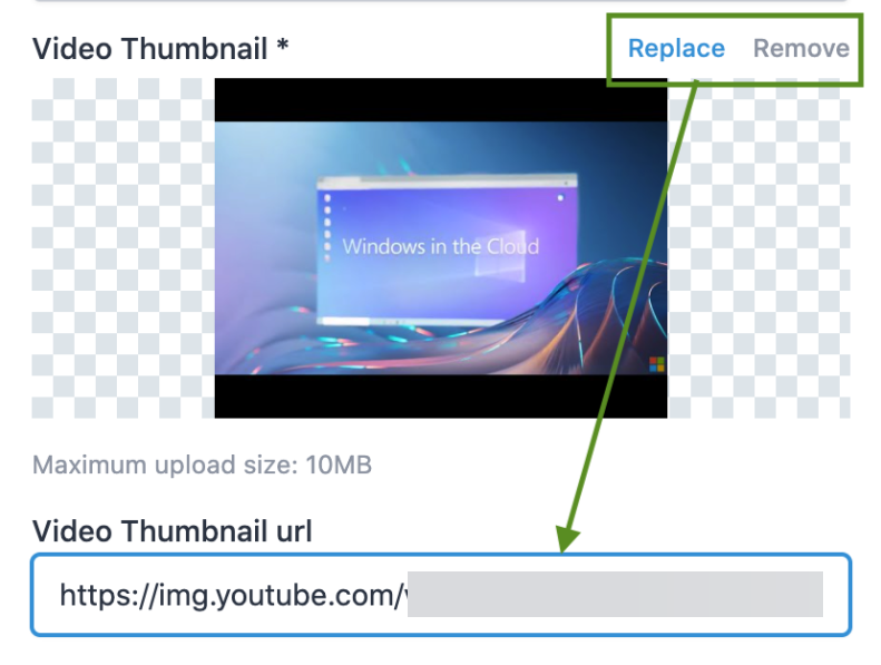 - The editor will try to fetch the default thumbnail image from the Video URL based on the selected video type and fill this field automatically. Still, you can also provide your thumbnail image by adding its URL.