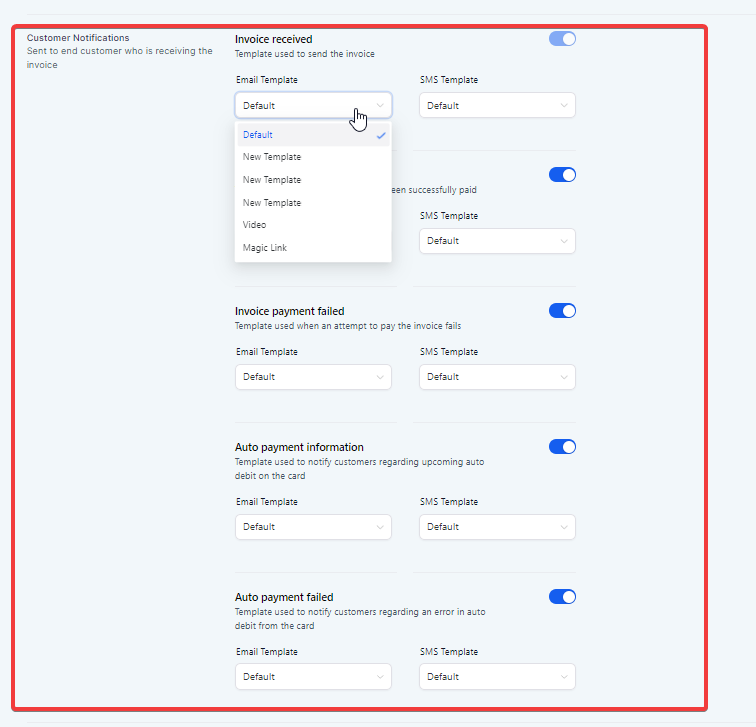 - Email and SMS notifications can be customized for the customer receiving the invoice under the Customer Notifications section