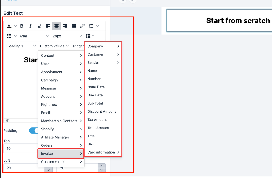 - Use the Invoice custom values in the Email and SMS builder to include details in notifications like customer information, invoice total, due date, invoice URL, etc.