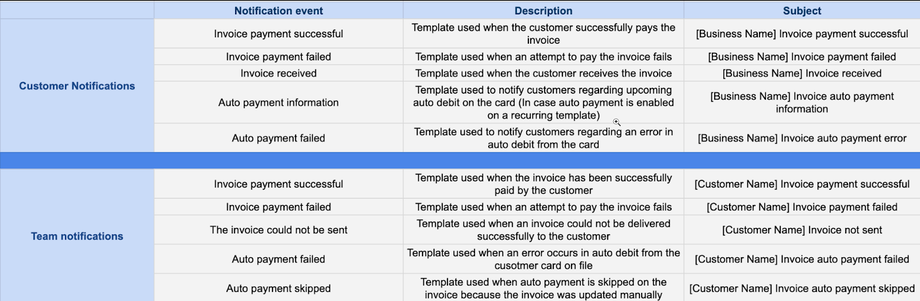 - To view the notification settings, navigate to Payments > Invoices and click on the settings gear