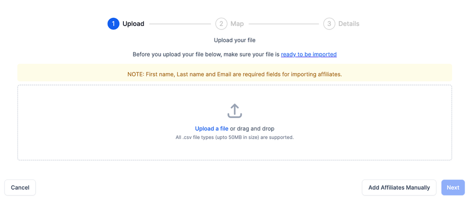 - Select New Affiliate to add an individual affiliate or Upload Affiliates to upload a list of multiple affiliates at once