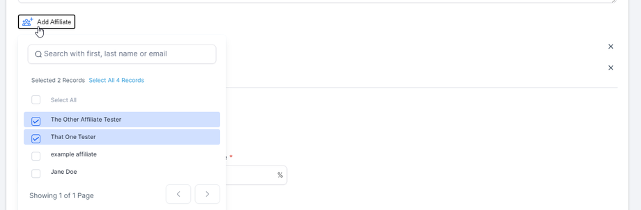 - For the individual Affiliate, fill out the pop-up that appears and click “Add Affiliate” to save their information.