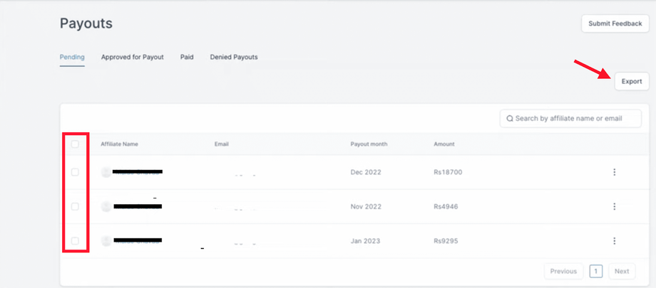 - To export your affiliate list, navigate to the ‘Payouts’ Section of the Affiliate tool, and click export