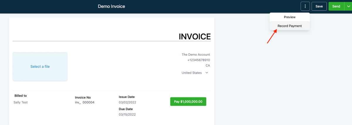 - Once you create the invoice, you can send it using the green button in the top right corner.