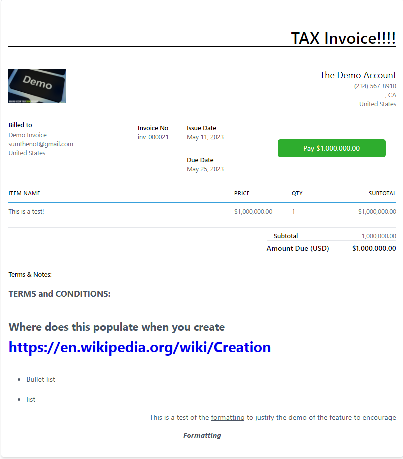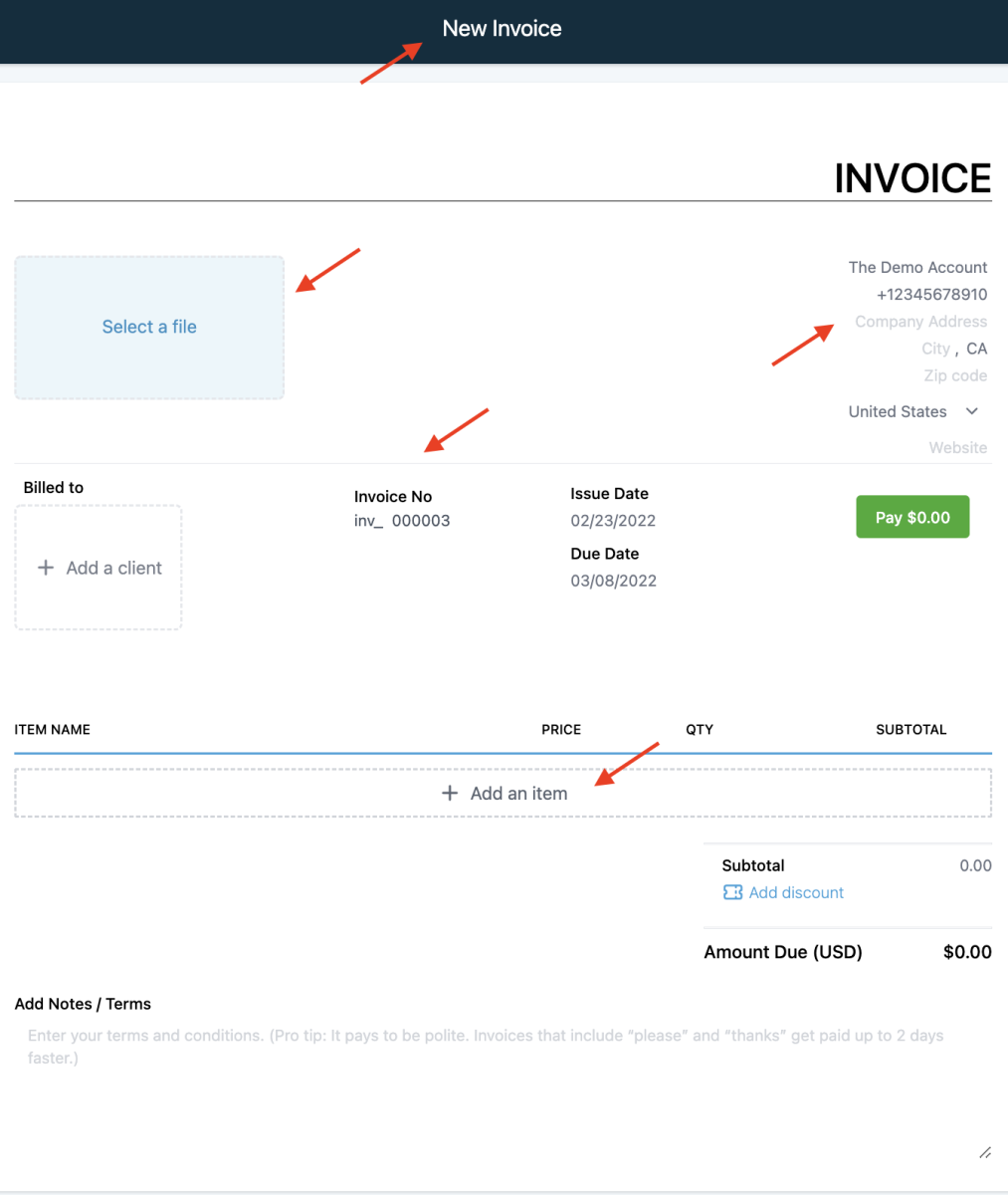 - Click on the Invoice Number, Issue Date, and Due Date to update and change each section.