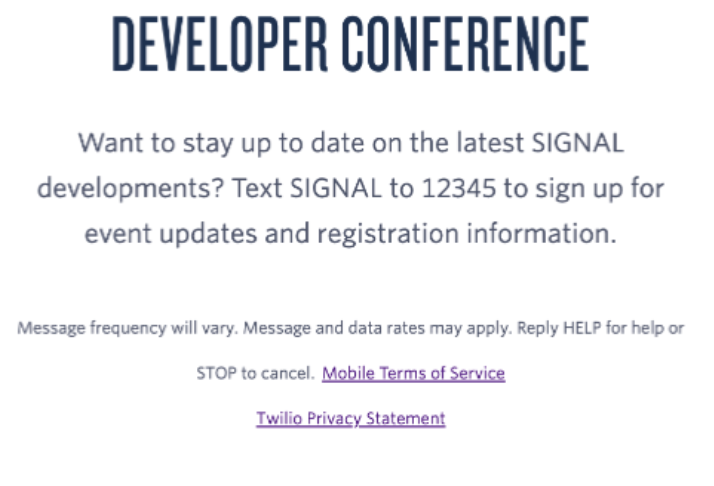 - an optional checkbox for message consent: you need to include the bolded part like the type of messaging you are sending, frequency, and how to opt out, e.g. I agree to receive marketing messaging from COMPANY_NAME at the phone number provided above. I understand I will receive 2 messages a month, data rates may apply, reply STOP to opt out